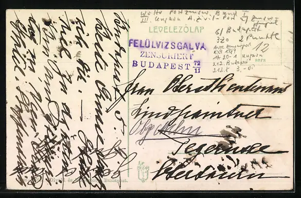 Personenbezogene Daten auf der Rückseite der Karte wurden durch blauen Textmarker unkenntlich gemacht. Die blauen Stellen sind auf die Vorderseite durchgeweicht und wirken sich negativ auf das Postkartenfoto aus
