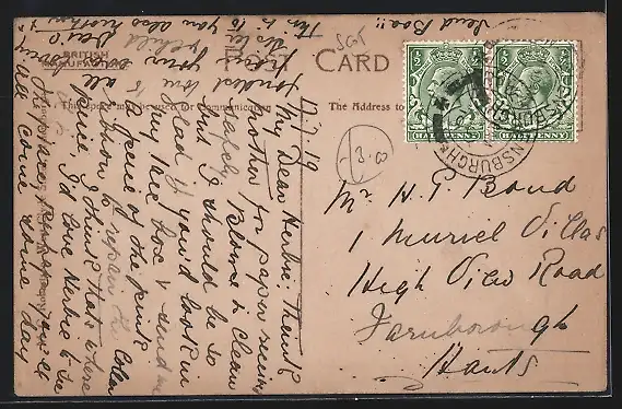 Personenbezogene Daten auf der Rückseite der Karte wurden durch blauen Textmarker unkenntlich gemacht. Die blauen Stellen sind auf die Vorderseite durchgeweicht und wirken sich negativ auf das Postkartenfoto aus