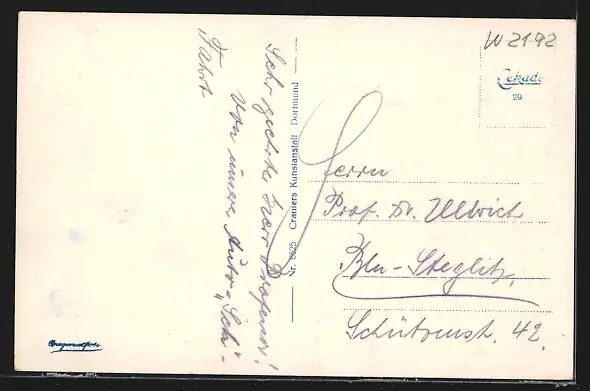 Personenbezogene Daten auf der Rückseite der Karte wurden durch blauen Textmarker unkenntlich gemacht. Die blauen Stellen sind auf die Vorderseite durchgeweicht und wirken sich negativ auf das Postkartenfoto aus