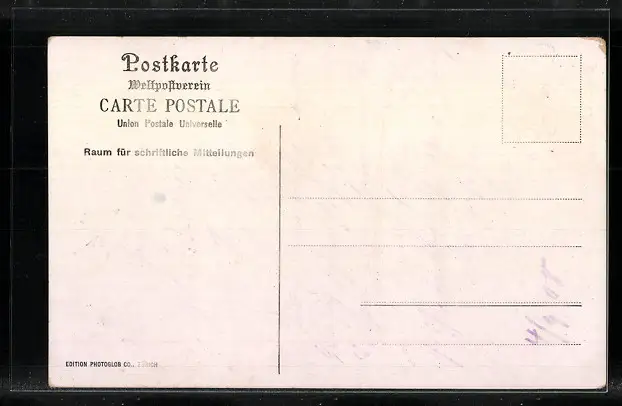 Personenbezogene Daten auf der Rückseite der Karte wurden durch blauen Textmarker unkenntlich gemacht. Die blauen Stellen sind auf die Vorderseite durchgeweicht und wirken sich negativ auf das Postkartenfoto aus