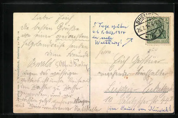 alte Ansichtskarte, gelaufen 1914, Eckknick li. boen, Stempelspur, guter Zustand