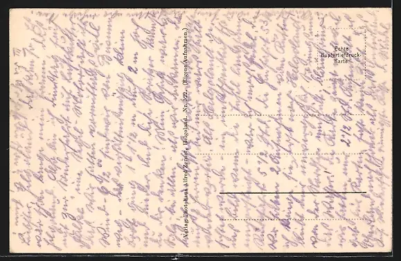 Personenbezogene Daten auf der Rückseite der Karte wurden durch blauen Textmarker unkenntlich gemacht. Die blauen Stellen sind auf die Vorderseite durchgeweicht und wirken sich negativ auf das Postkartenfoto aus