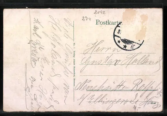 alte Ansichtskarte, gelaufen, Briefmarke entfernt, rückseitig Oberflächenschaden, Eckknick re. oben, Stempelspur, Bugspur re. oben