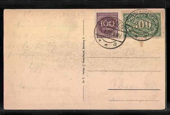 Personenbezogene Daten auf der Rückseite der Karte wurden durch blauen Textmarker unkenntlich gemacht. Die blauen Stellen sind auf die Vorderseite durchgeweicht und wirken sich negativ auf das Postkartenfoto aus