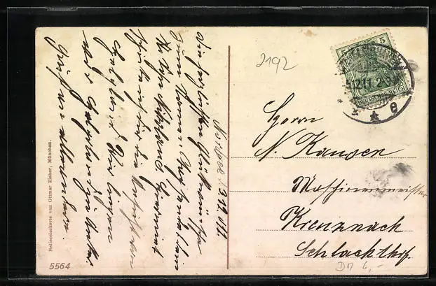 Personenbezogene Daten auf der Rückseite der Karte wurden durch blauen Textmarker unkenntlich gemacht. Die blauen Stellen sind auf die Vorderseite durchgeweicht und wirken sich negativ auf das Postkartenfoto aus