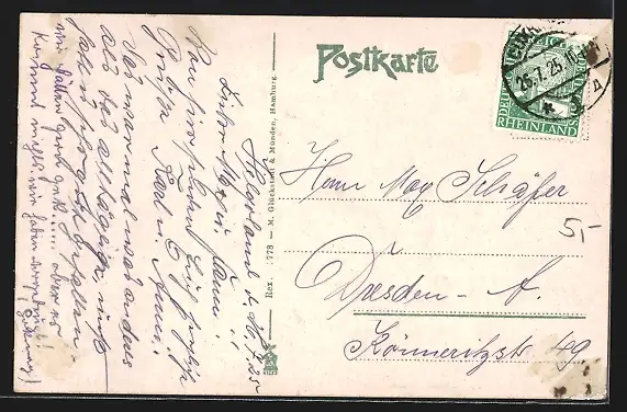 alte Ansichtskarte, gelaufen 1925, rückseitig Klebe- und Papierreste