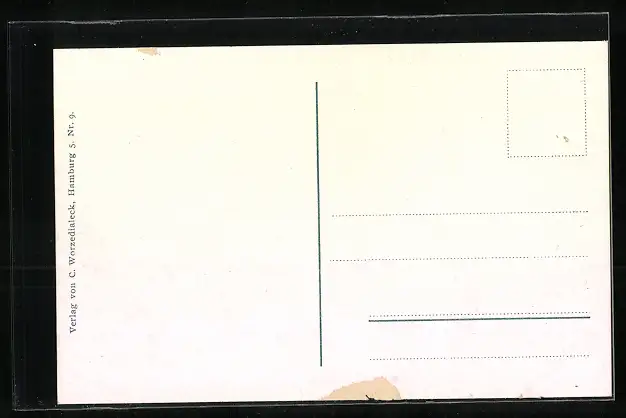Personenbezogene Daten auf der Rückseite der Karte wurden durch blauen Textmarker unkenntlich gemacht. Die blauen Stellen sind auf die Vorderseite durchgeweicht und wirken sich negativ auf das Postkartenfoto aus