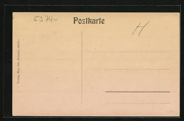 Personenbezogene Daten auf der Rückseite der Karte wurden durch blauen Textmarker unkenntlich gemacht. Die blauen Stellen sind auf die Vorderseite durchgeweicht und wirken sich negativ auf das Postkartenfoto aus