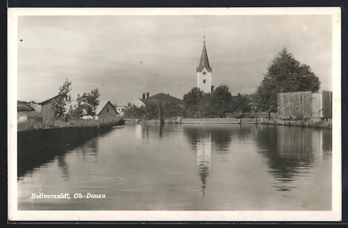 AK Hellmonsödt /Ob.-Donau, Donaupartie mit Blick auf die Kirche
