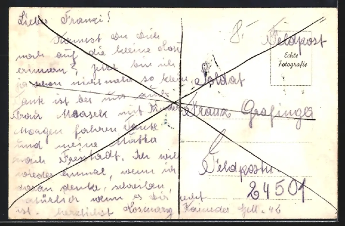 Personenbezogene Daten auf der Rückseite der Karte wurden durch blauen Textmarker unkenntlich gemacht. Die blauen Stellen sind auf die Vorderseite durchgeweicht und wirken sich negativ auf das Postkartenfoto aus