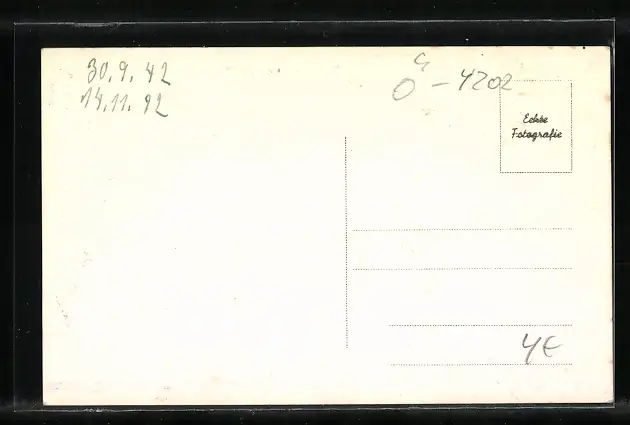 Personenbezogene Daten auf der Rückseite der Karte wurden durch blauen Textmarker unkenntlich gemacht. Die blauen Stellen sind auf die Vorderseite durchgeweicht und wirken sich negativ auf das Postkartenfoto aus
