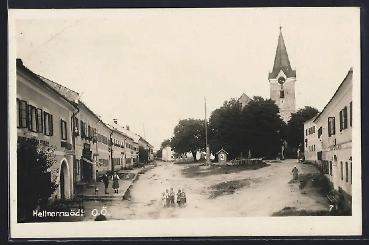 AK Hellmonsödt, Strassenpartie im Ortskern mit Kirche