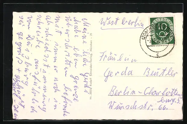 Personenbezogene Daten auf der Rückseite der Karte wurden durch blauen Textmarker unkenntlich gemacht. Die blauen Stellen sind auf die Vorderseite durchgeweicht und wirken sich negativ auf das Postkartenfoto aus
