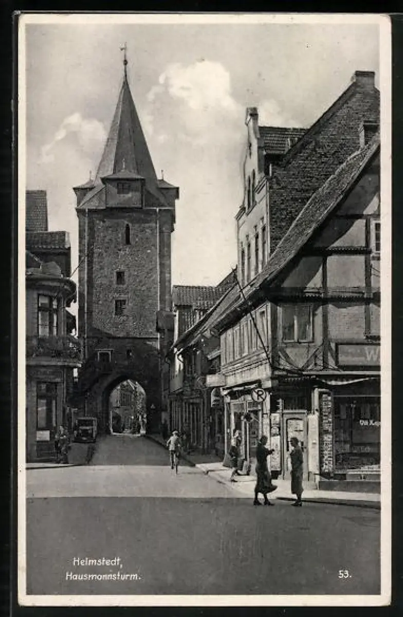 AK Helmstedt, Strassenpartie am Hausmannsturm mit Geschäften