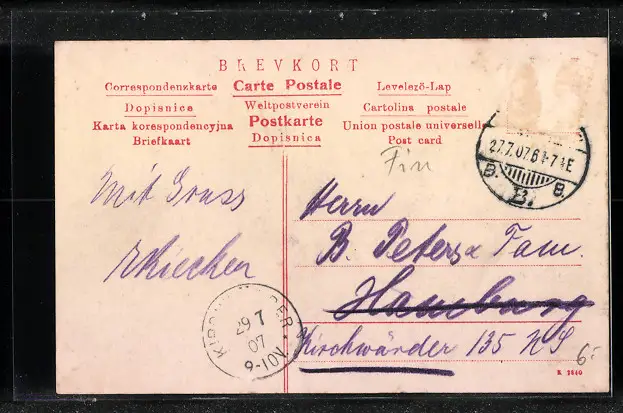 alte Ansichtskarte, gelaufen 1907, Briefmarke entfernt, rückseitig Oberflächenschaden, guter Zustand