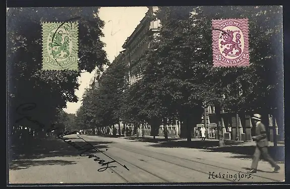AK Helsingfors, Strassenpartie mit Bahngleisen