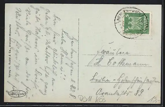 Personenbezogene Daten auf der Rückseite der Karte wurden durch blauen Textmarker unkenntlich gemacht. Die blauen Stellen sind auf die Vorderseite durchgeweicht und wirken sich negativ auf das Postkartenfoto aus