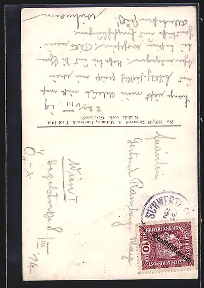 Personenbezogene Daten auf der Rückseite der Karte wurden durch blauen Textmarker unkenntlich gemacht. Die blauen Stellen sind auf die Vorderseite durchgeweicht und wirken sich negativ auf das Postkartenfoto aus