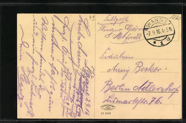Personenbezogene Daten auf der Rückseite der Karte wurden durch blauen Textmarker unkenntlich gemacht. Die blauen Stellen sind auf die Vorderseite durchgeweicht und wirken sich negativ auf das Postkartenfoto aus