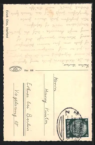 Personenbezogene Daten auf der Rückseite der Karte wurden durch blauen Textmarker unkenntlich gemacht. Die blauen Stellen sind auf die Vorderseite durchgeweicht und wirken sich negativ auf das Postkartenfoto aus