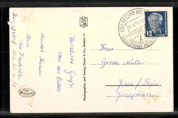 gelaufen 1951, rückseitig Klebe- und Papierreste, rückseitig Oberflächenschaden, guter Zustand