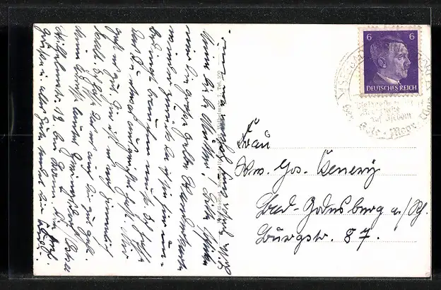 Personenbezogene Daten auf der Rückseite der Karte wurden durch blauen Textmarker unkenntlich gemacht. Die blauen Stellen sind auf die Vorderseite durchgeweicht und wirken sich negativ auf das Postkartenfoto aus