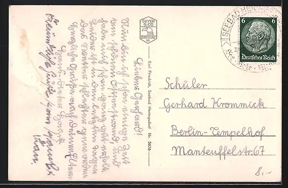 Personenbezogene Daten auf der Rückseite der Karte wurden durch blauen Textmarker unkenntlich gemacht. Die blauen Stellen sind auf die Vorderseite durchgeweicht und wirken sich negativ auf das Postkartenfoto aus