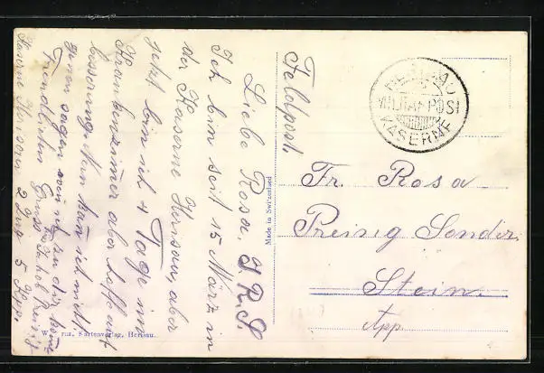 Personenbezogene Daten auf der Rückseite der Karte wurden durch blauen Textmarker unkenntlich gemacht. Die blauen Stellen sind auf die Vorderseite durchgeweicht und wirken sich negativ auf das Postkartenfoto aus