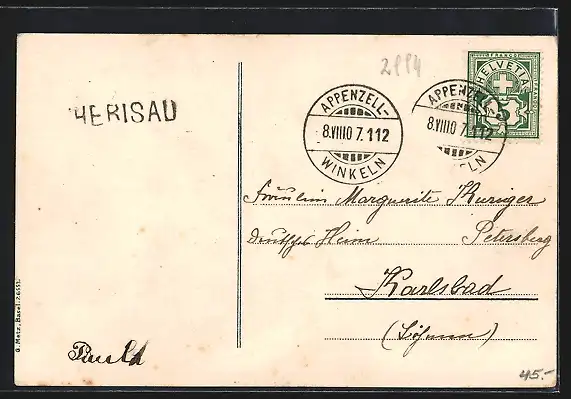 gelaufen 1907, Eckknick oben li., guter Zustand