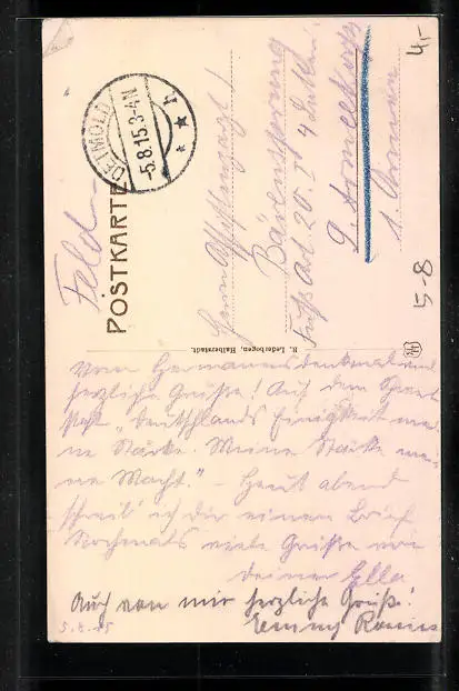 Personenbezogene Daten auf der Rückseite der Karte wurden durch blauen Textmarker unkenntlich gemacht. Die blauen Stellen sind auf die Vorderseite durchgeweicht und wirken sich negativ auf das Postkartenfoto aus