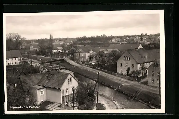 AK Hermsdorf b. Dresden, Ortsansicht mit Fluss