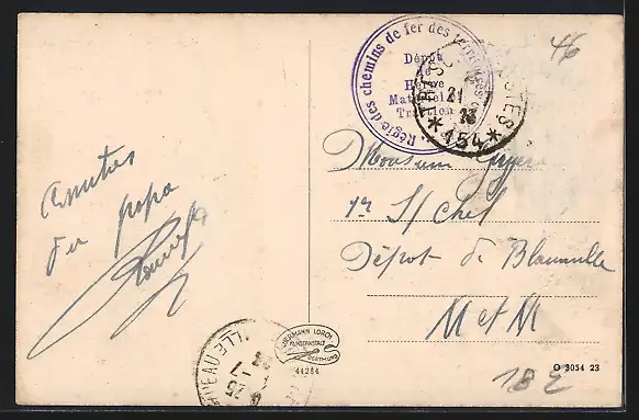 Personenbezogene Daten auf der Rückseite der Karte wurden durch blauen Textmarker unkenntlich gemacht. Die blauen Stellen sind auf die Vorderseite durchgeweicht und wirken sich negativ auf das Postkartenfoto aus