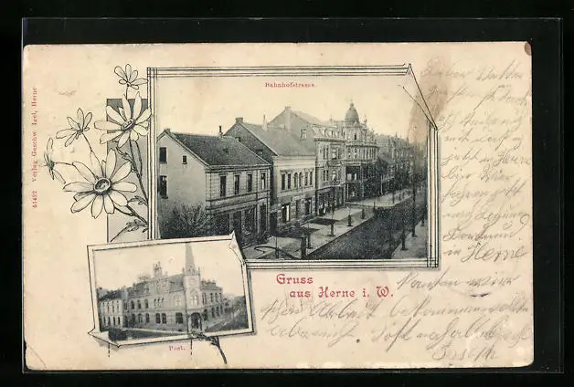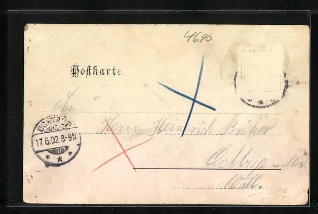 alte Ansichtskarte, gelaufen 1902, Eckknicke unten li., Abriebspuren unten re., Briefmarke entfernt, rückseitig Oberflächenschaden, guter Zustand