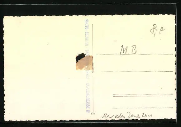 Personenbezogene Daten auf der Rückseite der Karte wurden durch blauen Textmarker unkenntlich gemacht. Die blauen Stellen sind auf die Vorderseite durchgeweicht und wirken sich negativ auf das Postkartenfoto aus