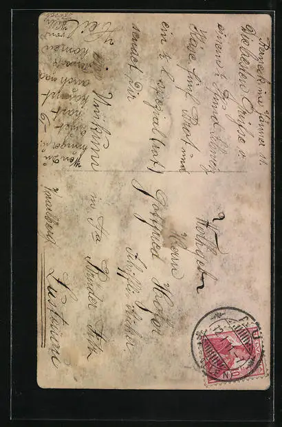 Personenbezogene Daten auf der Rückseite der Karte wurden durch blauen Textmarker unkenntlich gemacht. Die blauen Stellen sind auf die Vorderseite durchgeweicht und wirken sich negativ auf das Postkartenfoto aus
