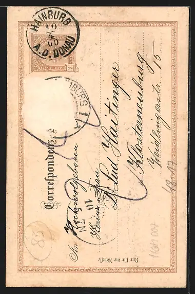 gelaufen 1900, Briefmarke entfernt, rückseitig Oberflächenschaden, guter Zustand