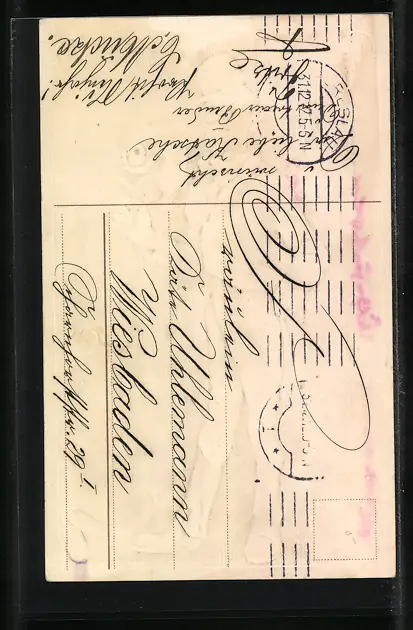 Personenbezogene Daten auf der Rückseite der Karte wurden durch blauen Textmarker unkenntlich gemacht. Die blauen Stellen sind auf die Vorderseite durchgeweicht und wirken sich negativ auf das Postkartenfoto aus