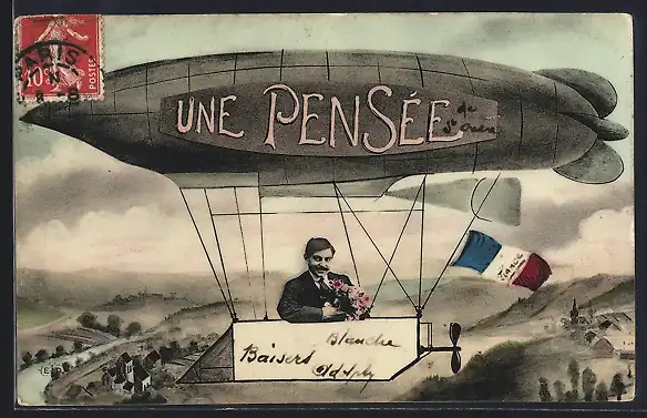 AK Herr sitzt in einem Zeppelin mit Französischer Flagge