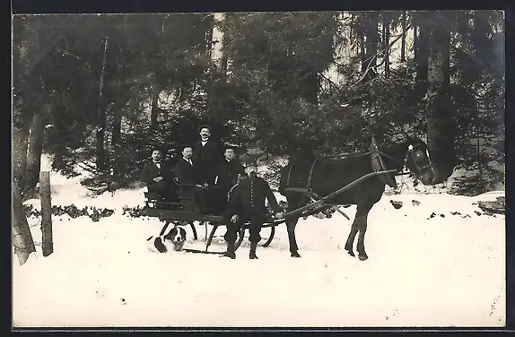 AK Herrengruppe in Begleitung eines Bernhardiners auf einem Pferdeschlitten