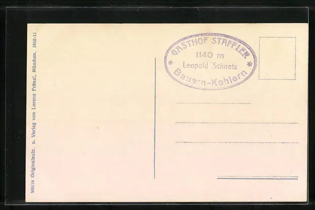 Personenbezogene Daten auf der Rückseite der Karte wurden durch blauen Textmarker unkenntlich gemacht. Die blauen Stellen sind auf die Vorderseite durchgeweicht und wirken sich negativ auf das Postkartenfoto aus