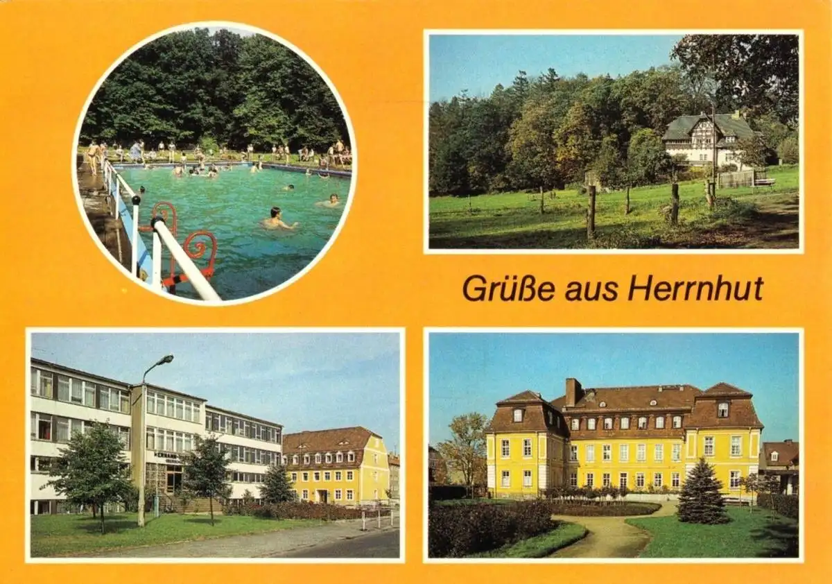 Ansichtskarte Herrnhut vier Abb., gestaltet Waldbad, Landschaftsschutzgebiet, Hermann-Matern-Oberschule, Förderzentrum Erhaltung I ungelaufen Druckvermerk: 1987 Herstellungsland: DDR Verlag: Bild und Heimat, Reichenbach i. V. - 01 12 1241/10