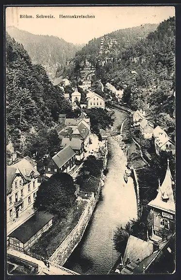 AK Herrnskretschen /Böhm. Schweiz, Ortsansicht am Fluss