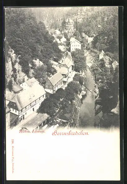 AK Herrnskretschen / Hrensko, Ortstotale mit dem Fluss in der Böhm. Schweiz