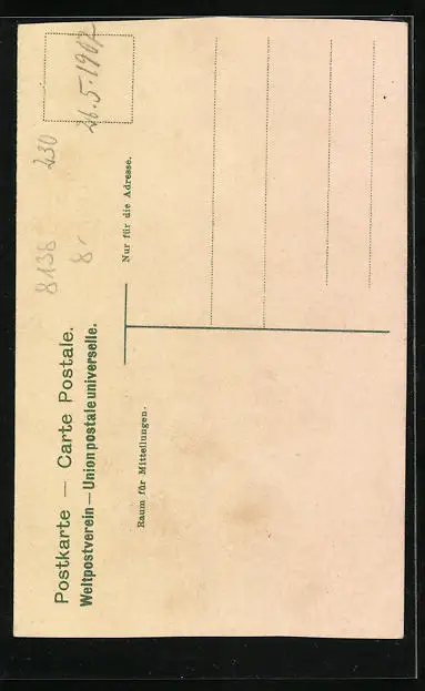 Personenbezogene Daten auf der Rückseite der Karte wurden durch blauen Textmarker unkenntlich gemacht. Die blauen Stellen sind auf die Vorderseite durchgeweicht und wirken sich negativ auf das Postkartenfoto aus