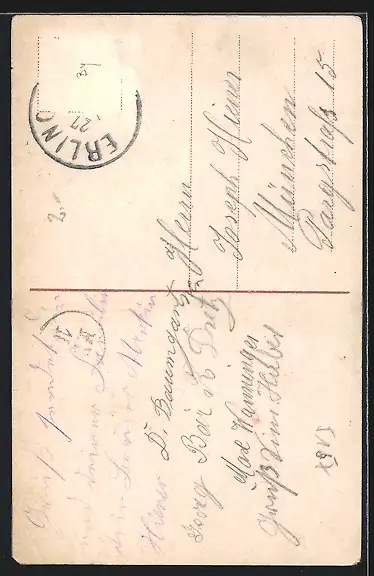 Personenbezogene Daten auf der Rückseite der Karte wurden durch blauen Textmarker unkenntlich gemacht. Die blauen Stellen sind auf die Vorderseite durchgeweicht und wirken sich negativ auf das Postkartenfoto aus