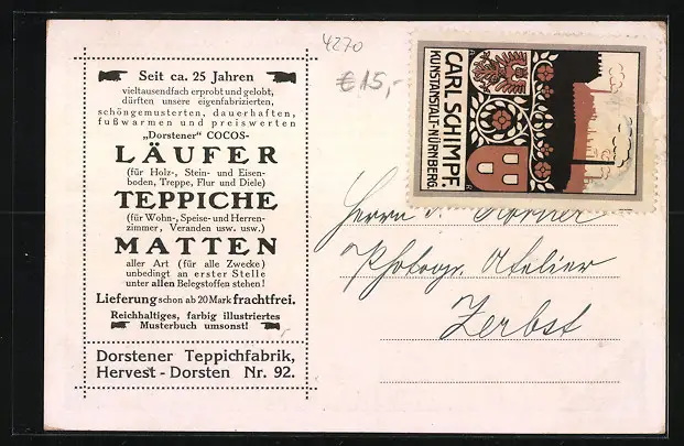 AK Hervest-Dorsten, Dorstener Teppichfabrik, Nr. 92, Reklame