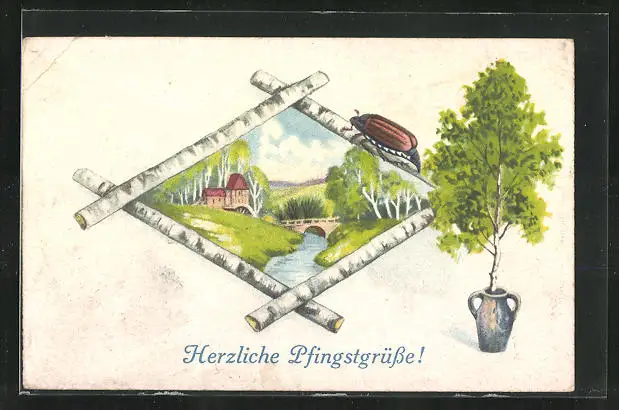AK Herzliche Pfingstgrüsse!, Birkenlaub, Maikäfer