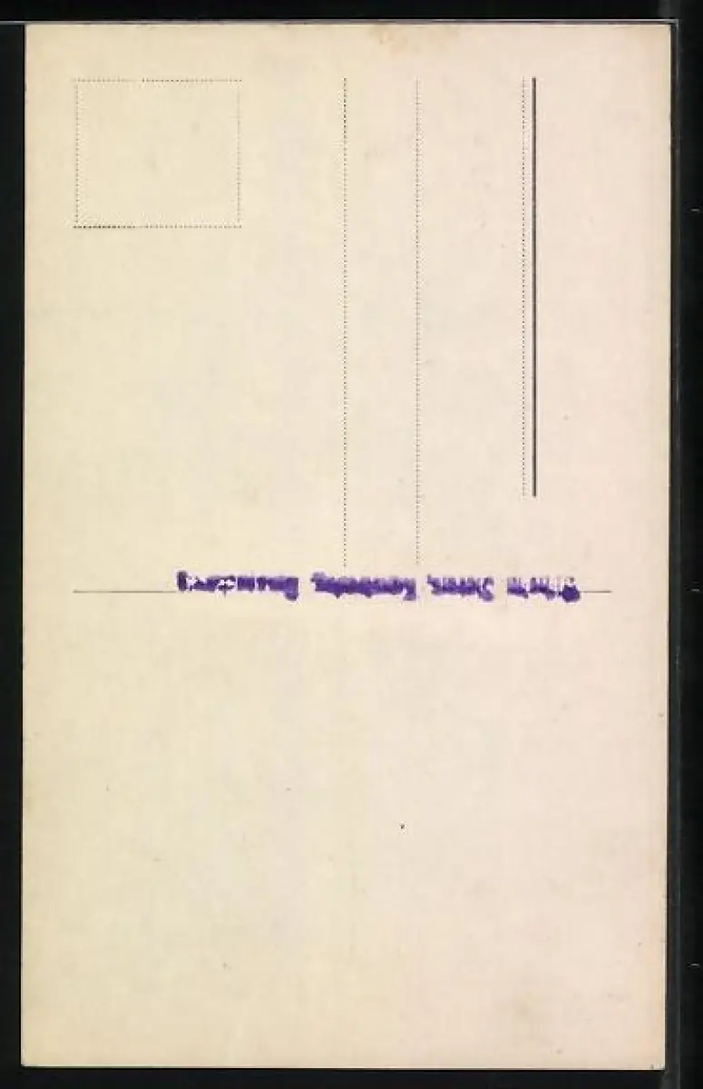 Personenbezogene Daten auf der Rückseite der Karte wurden durch blauen Textmarker unkenntlich gemacht. Die blauen Stellen sind auf die Vorderseite durchgeweicht und wirken sich negativ auf das Postkartenfoto aus