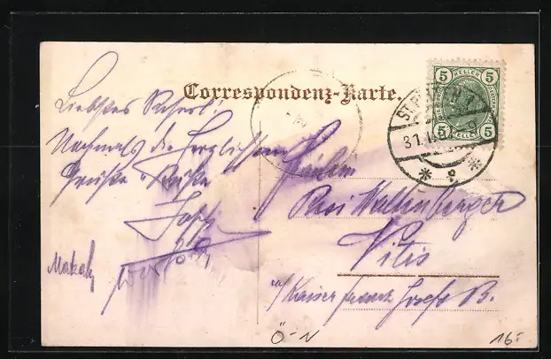 Personenbezogene Daten auf der Rückseite der Karte wurden durch blauen Textmarker unkenntlich gemacht. Die blauen Stellen sind auf die Vorderseite durchgeweicht und wirken sich negativ auf das Postkartenfoto aus
