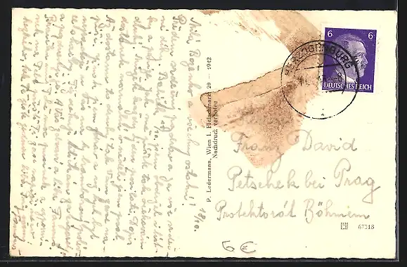 Personenbezogene Daten auf der Rückseite der Karte wurden durch blauen Textmarker unkenntlich gemacht. Die blauen Stellen sind auf die Vorderseite durchgeweicht und wirken sich negativ auf das Postkartenfoto aus